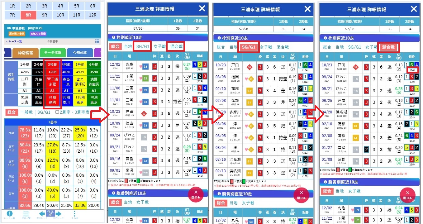 出走表の選手名を押すと表示される選手情報の直近10走に「SG/G1」の絞りこみと女子選手の「混合戦」の絞込みができるようになりました。