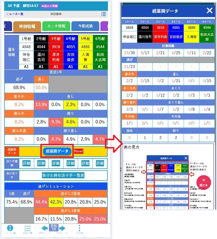 ご意見募集で好評でした選手の1マークの攻めがわかる「超展開データ」を当日分のみボートレース日和で見れるようになりました。