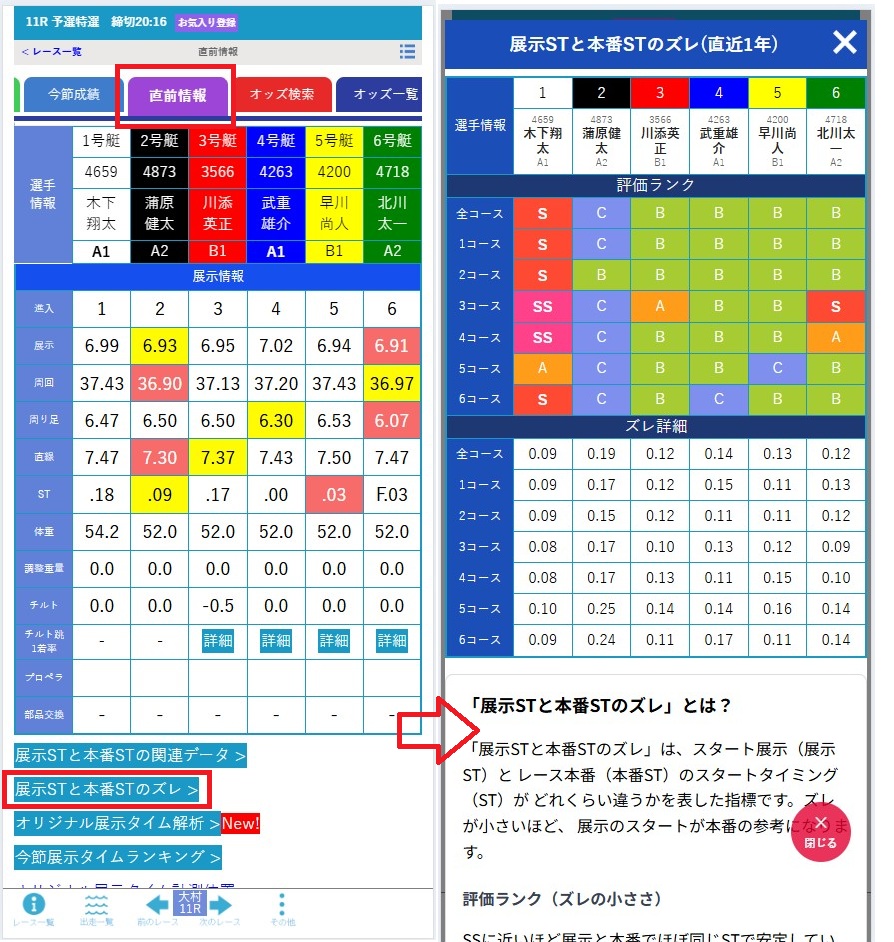 出走表の「直前情報」タブの「」展示STと本番STのズレ」ボタンを押してご利用下さい。